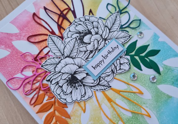 So fussy cut a few flowers and stuck them in the middle with the rainbow of leaf die cuts coming out from underneath.