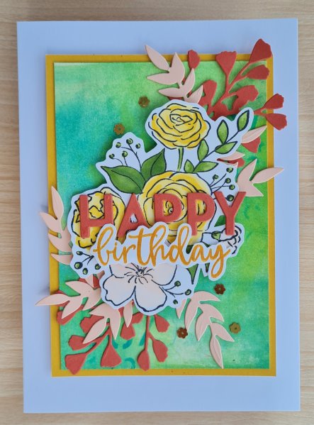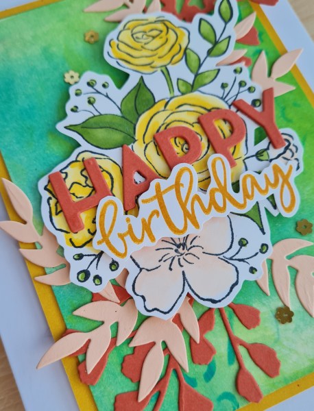 The white base I decided to blend some So Saffron on and do some splatters of green and coral ink to complement the colours in the rest of the card.