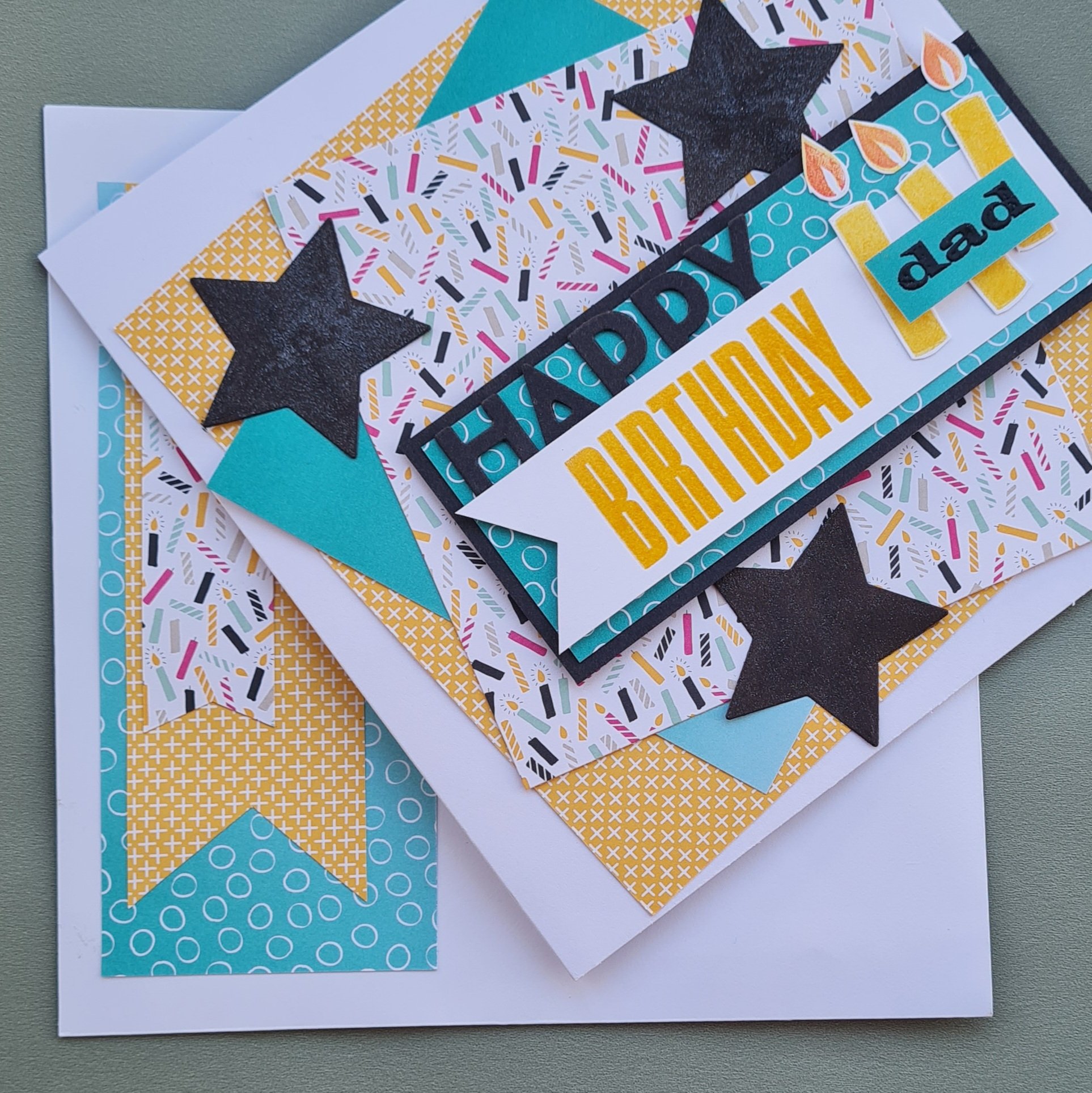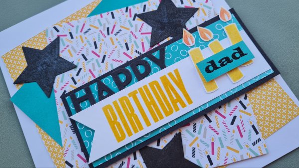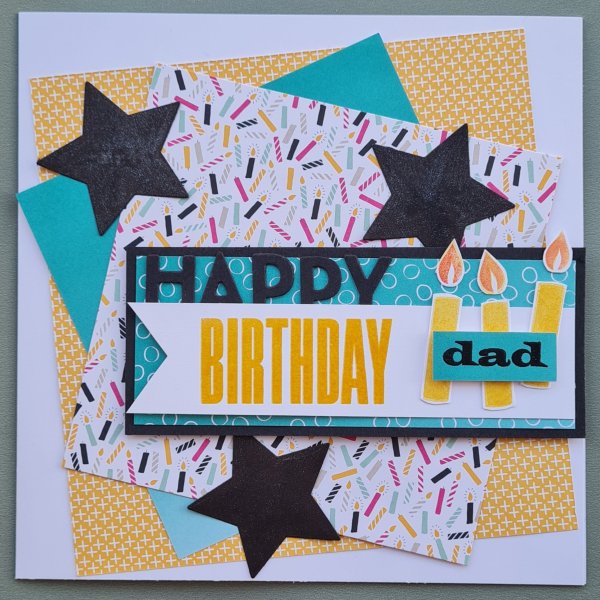 I decided to pick up on the black in the candle paper to add some black elements… the stamped Dad, the die cut stars and the die cut Happy.
