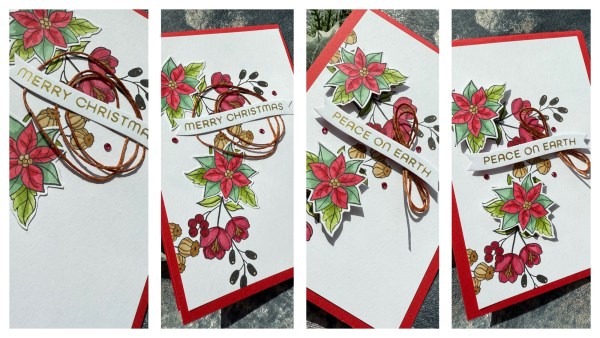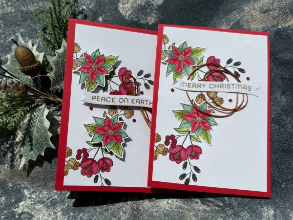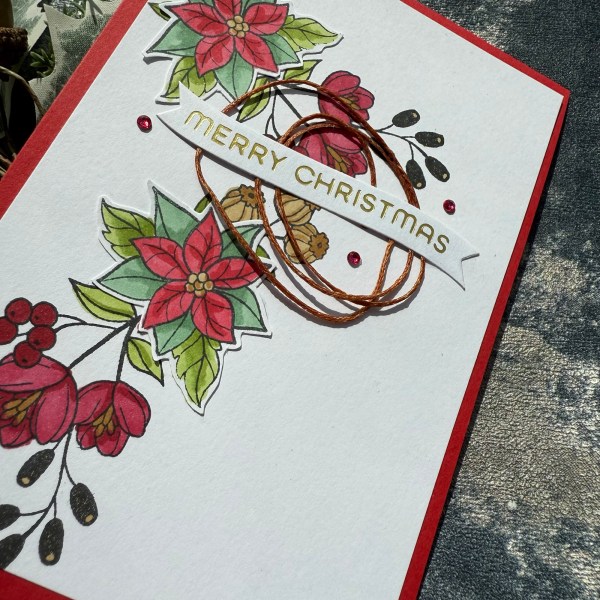 The second card I kept flat – I used glue to adhere the poinsettia and then glue to add the sentiment with the thread nested underneath. This does give a little dimension to the sentiment but not much!