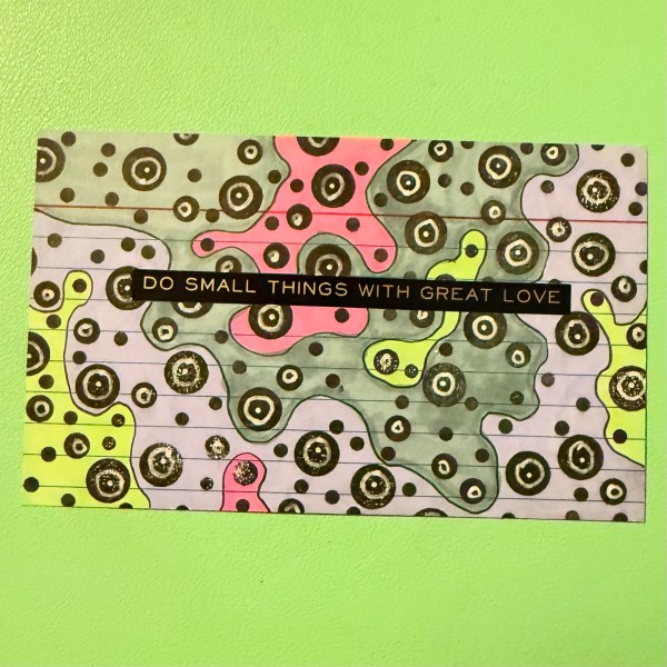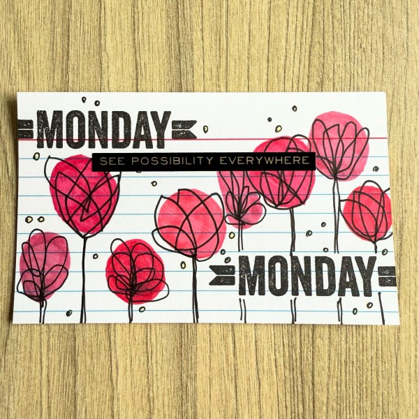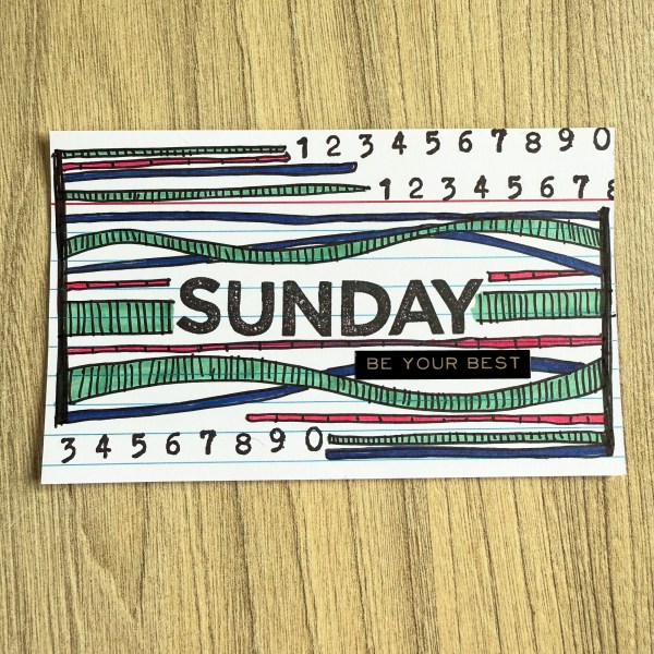 Day 34 … I changed it up by using a script stamp all over the background and then concentrated on the doodles so the stamping isn’t the focal element but the sentiment and colours are what draw the eye instead. And went for all the greens for my colouring!