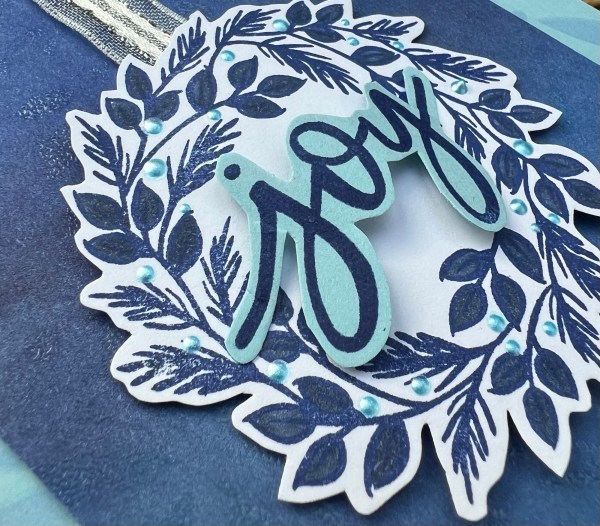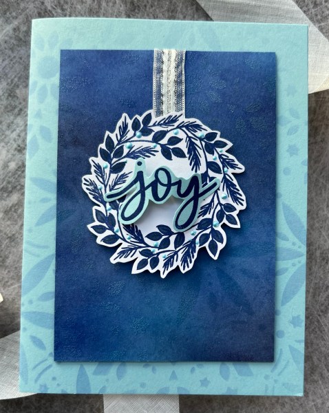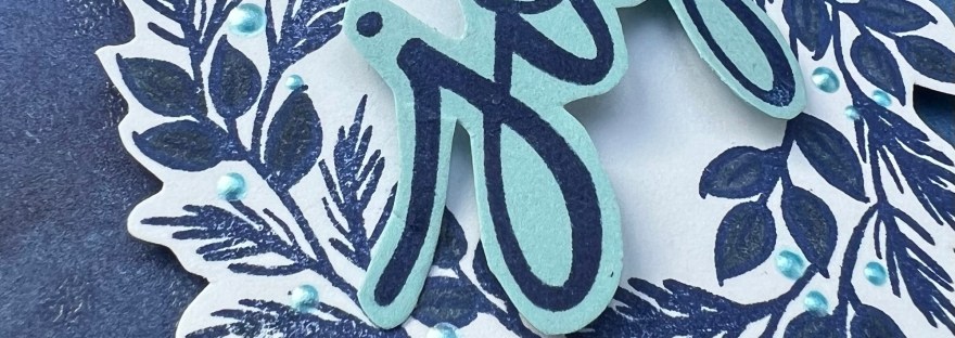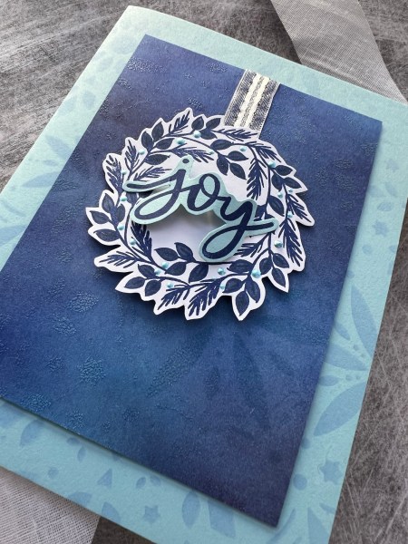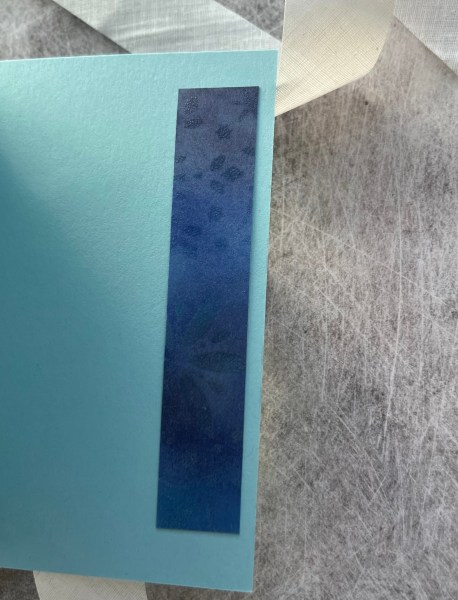 I created a cluster in the middle of the card of blue cardstock and some blue paper scrap that was on my desk. I had also reclaimed the star embellishment off the card I made for my hubby (we don’t keep them after Christmas as so I always recycle or reclaim elements I think I can use again) and I thought it would work well on the card.