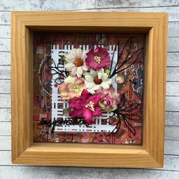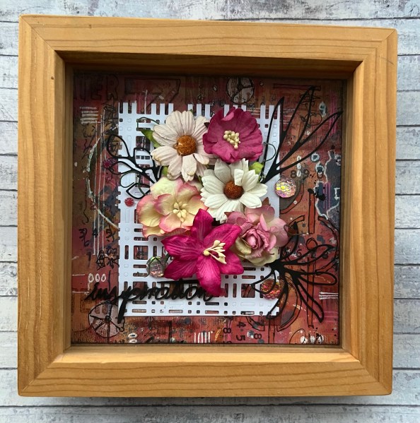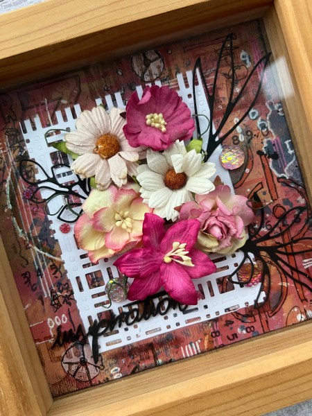 I die cut a smaller panel of white for the background to the flowers, I stuck the flowers and the gems in place. I added the die cut leaves which I painted black (as I couldn’t be bothered to die cut new ones out of black) and I found the wooden laser cut word in the stash and painted that black too.
