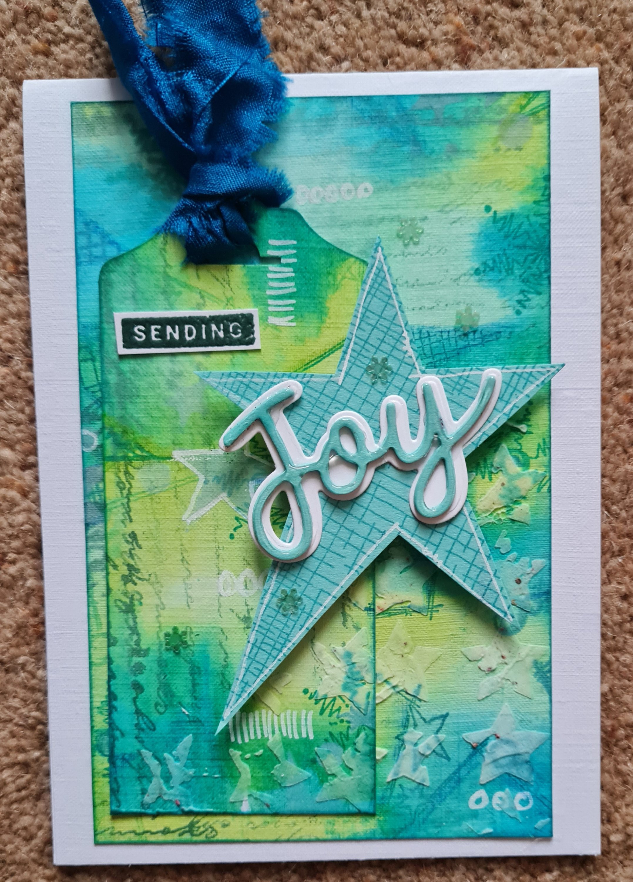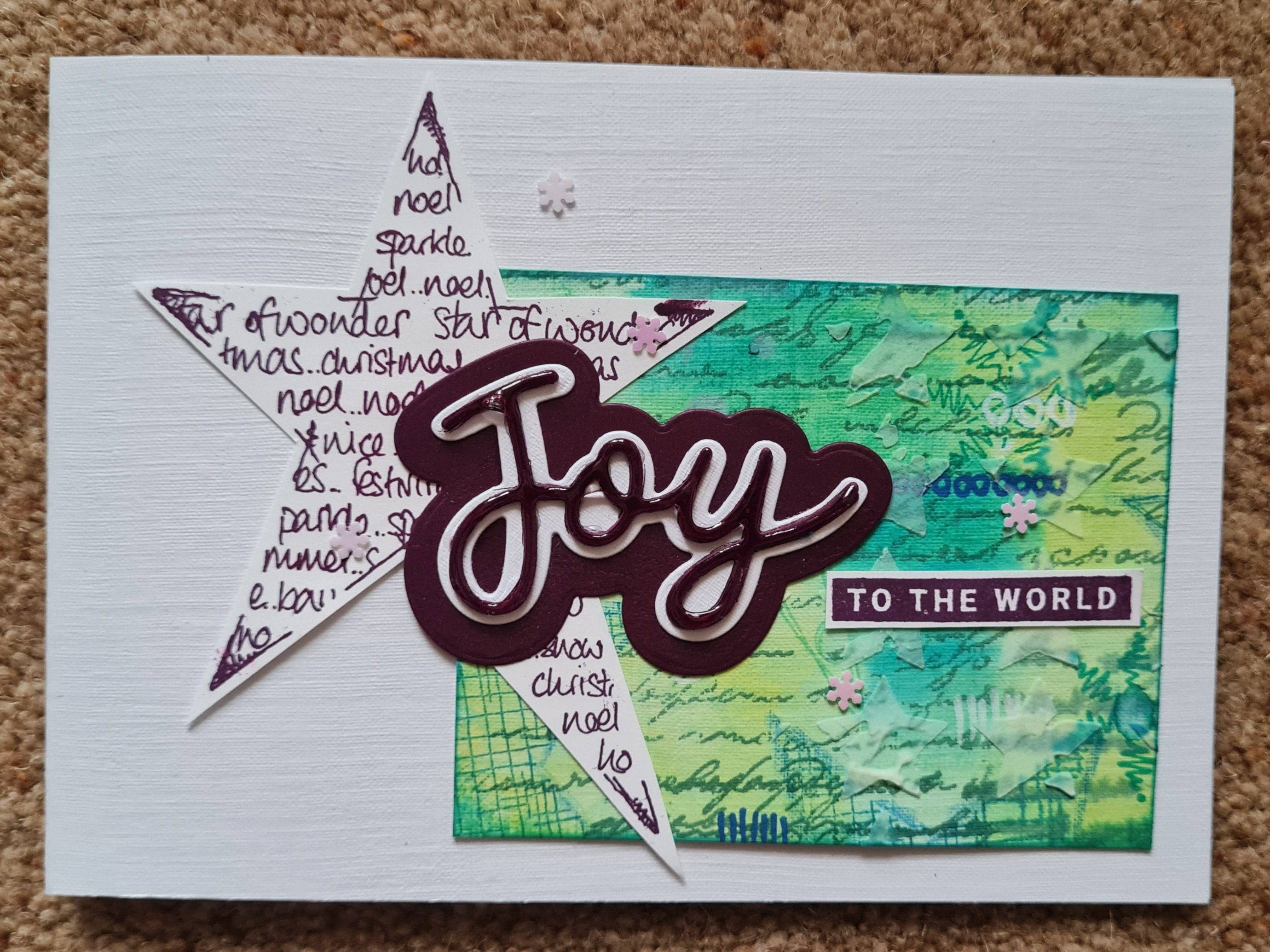 I also used some scrap white cardstock to stamp and fussy cut out some more stars using the Jofy stamps and the Peace and Joy word stamps.